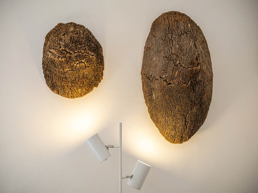Fotografias do quarto modelo do Hotel Aivado. Para além das vistas gerais do espaço, foram captados pormenores que evidenciam os materiais naturais utilizados, em ligação direta com a envolvente rural onde o hotel se insere.