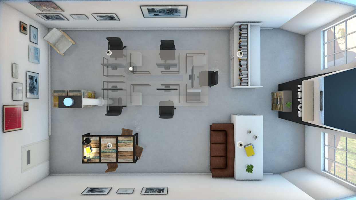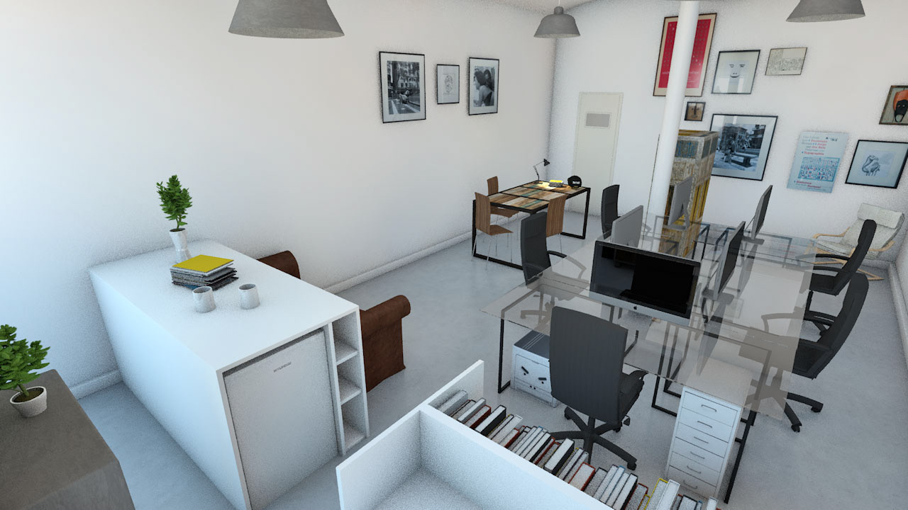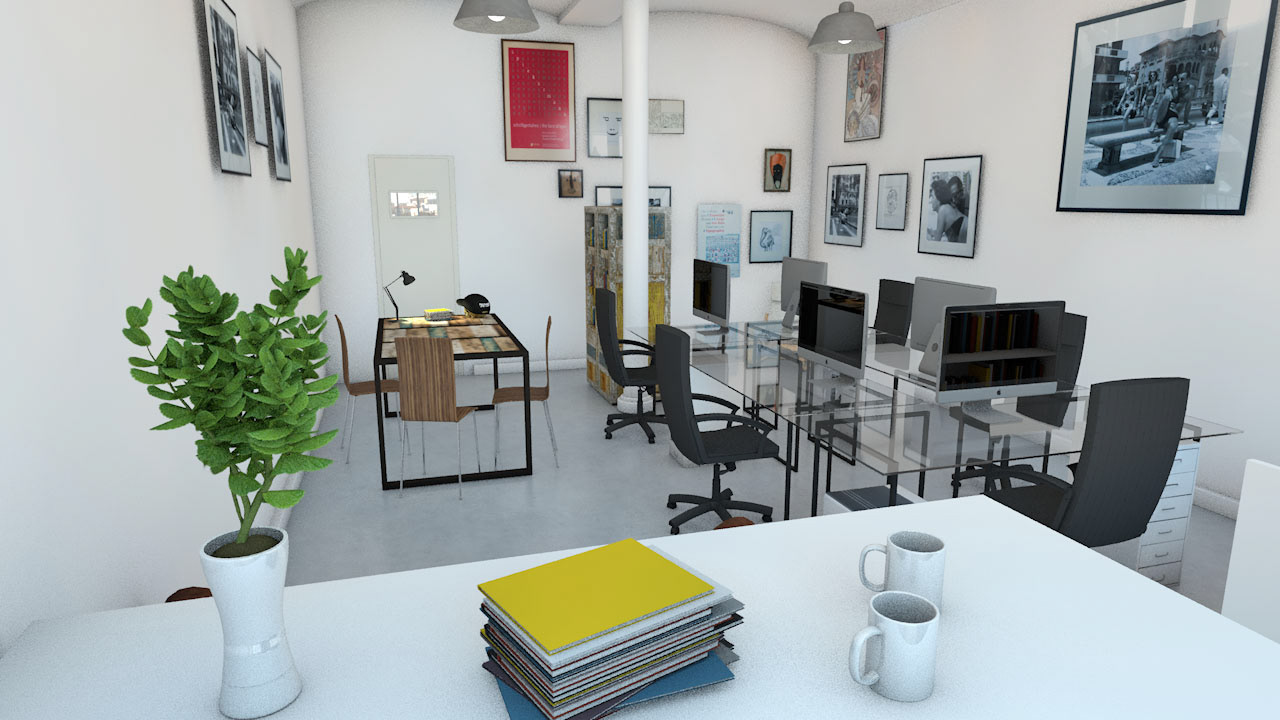 A 3D simulation and visualization of the new layout of a design studio. I've photographed all the the real objects and furniture that were present in the prior studio to then use them realistically in the simulation of the new space.