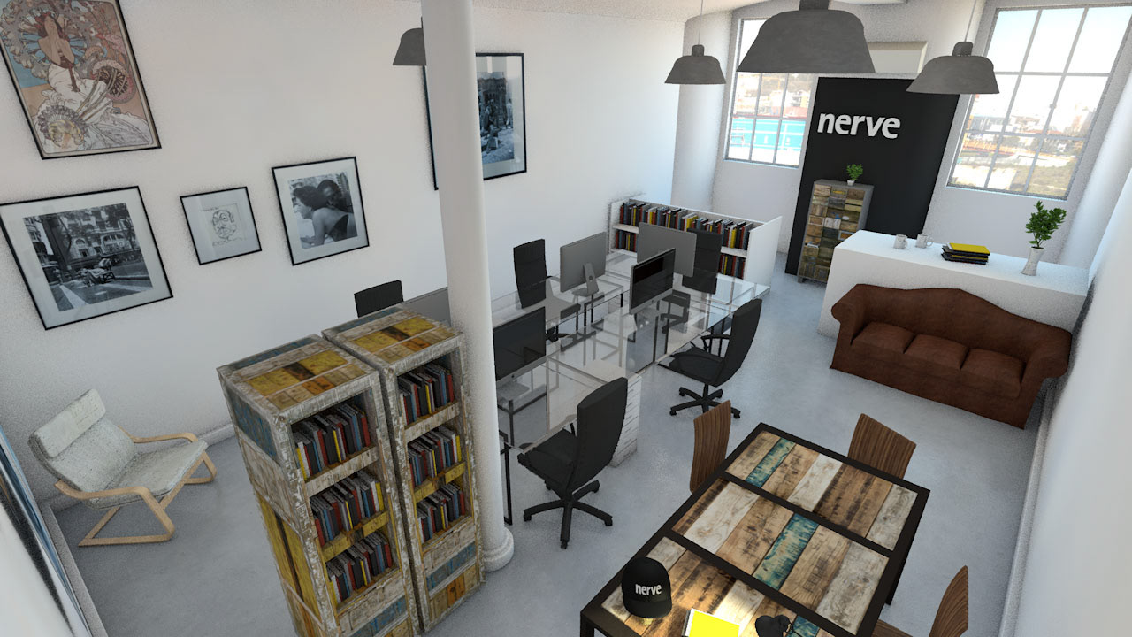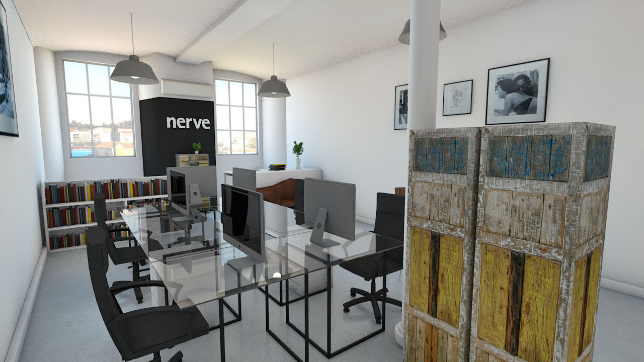 Uma simulação e pré-visualização 3D de uma reestruturação do espaço de um atelier de design. Fiz um levantamento fotográfico de todos os objetos e mobiliário presente no espaço anterior para os usar realisticamente no novo ambiente.