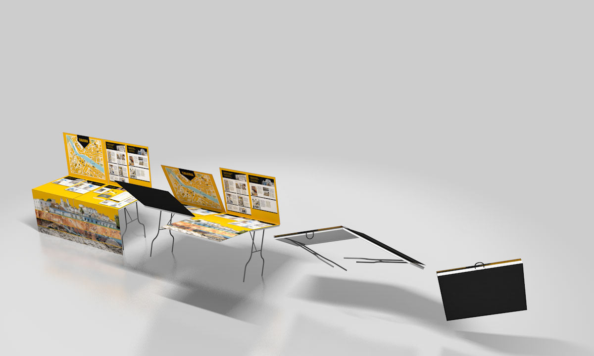 Simulação 3D de um conceito para uma exposição portátil baseada nos Guias Geológicos do Algarve (ver portfólio de design gráfico).
