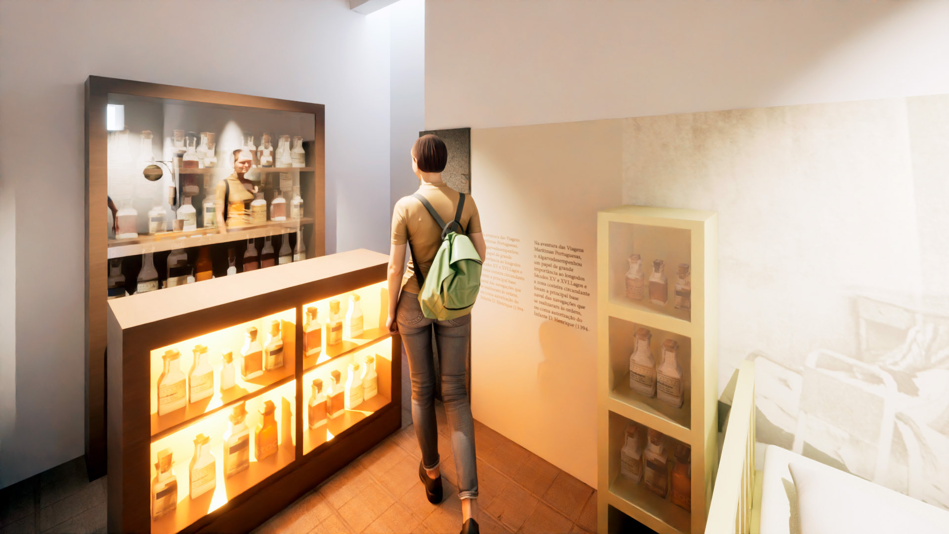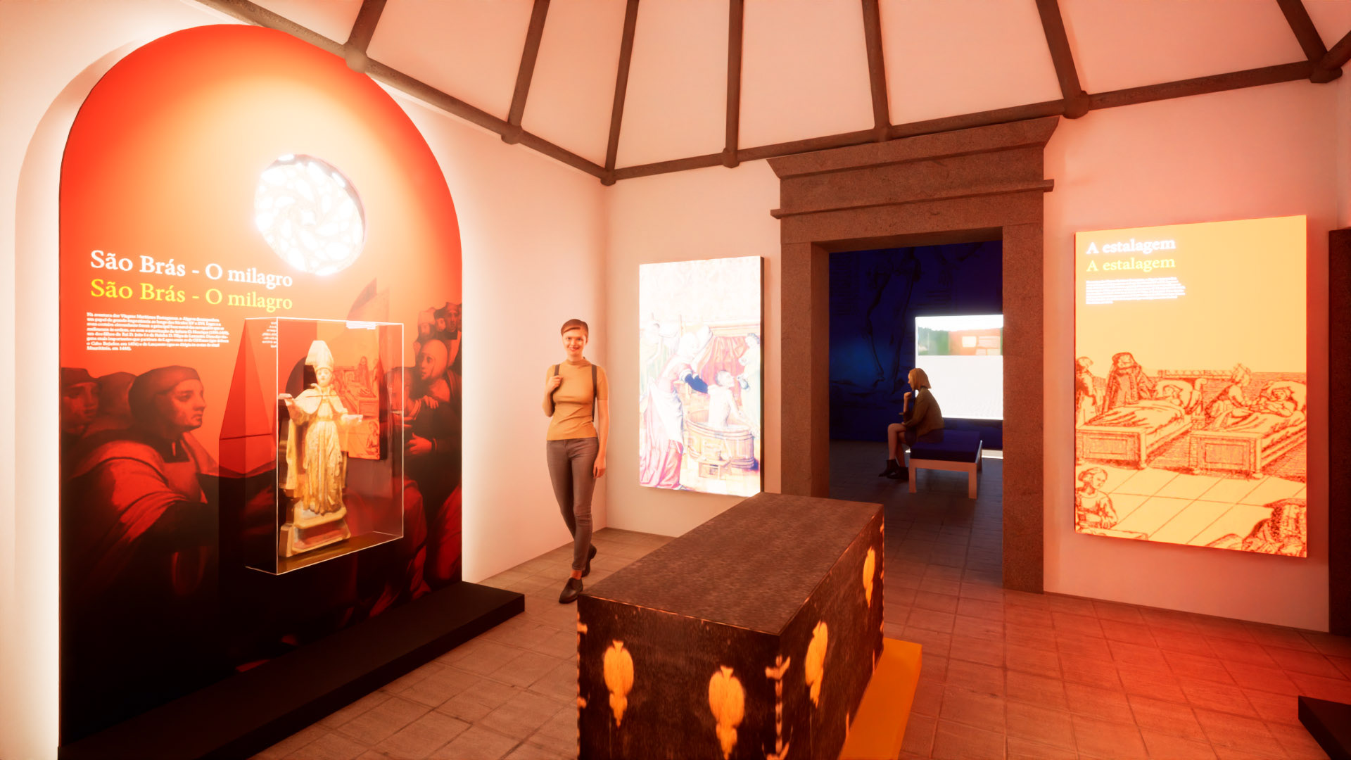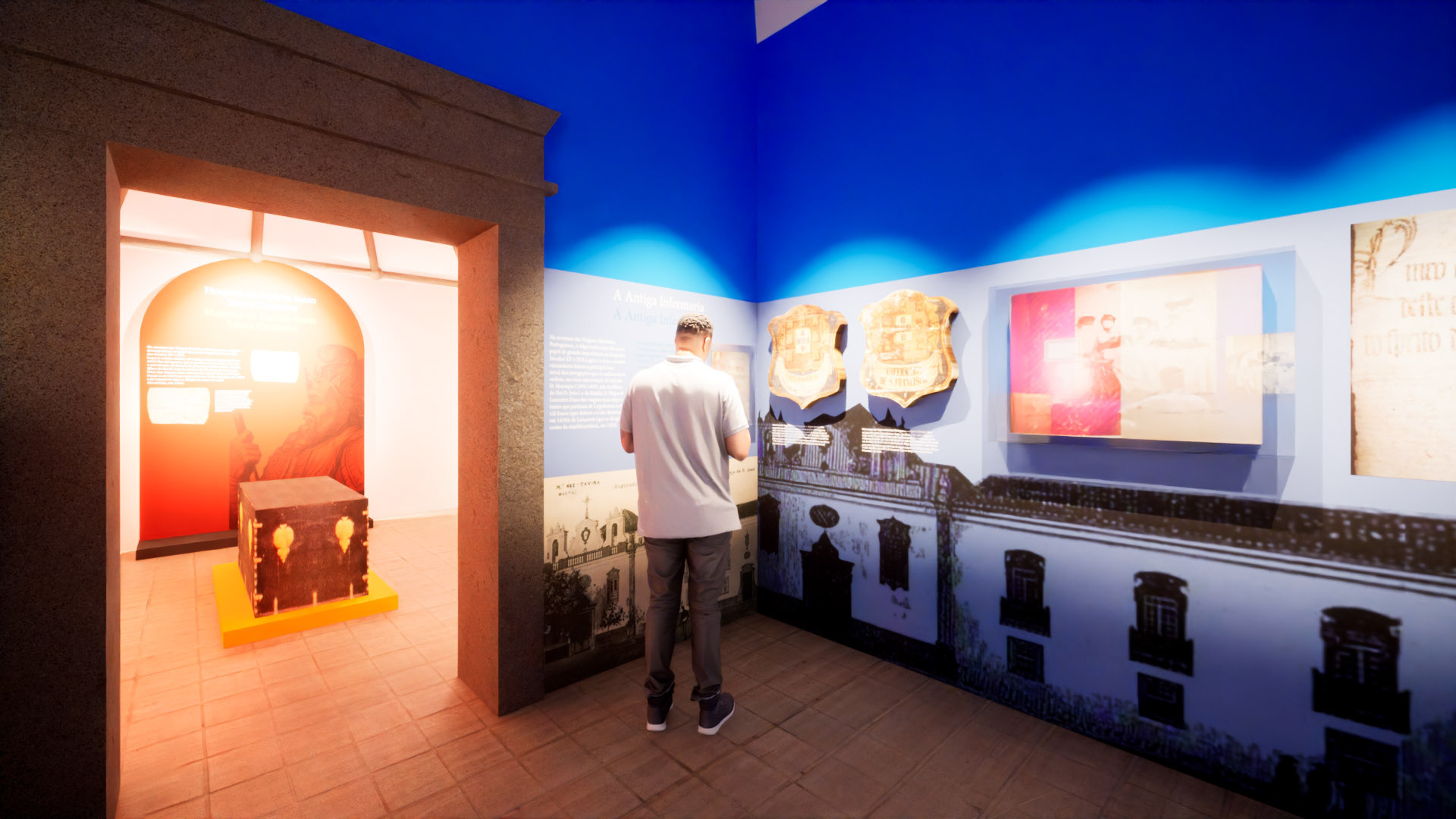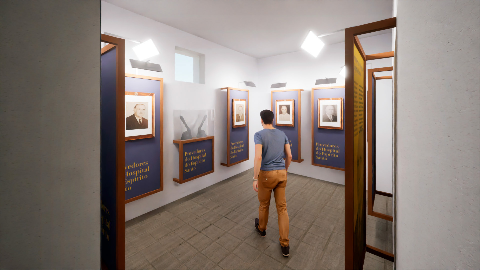 Simulação 3D de projeto de museografia projetado pela Nerve Design para o Hospital do Espírito Santo, Algarve, Portugal.