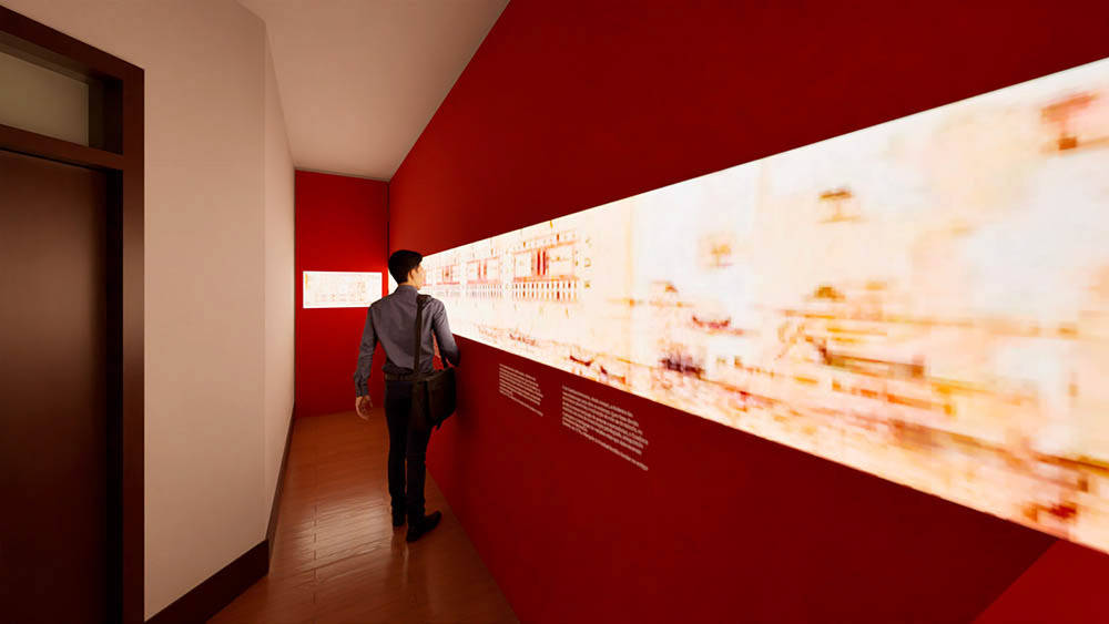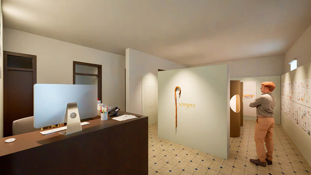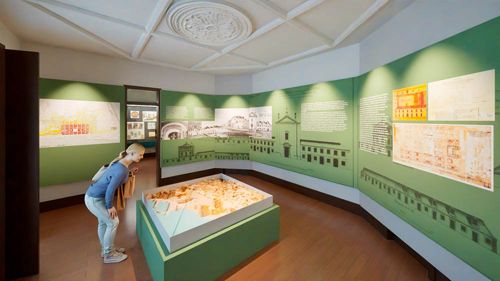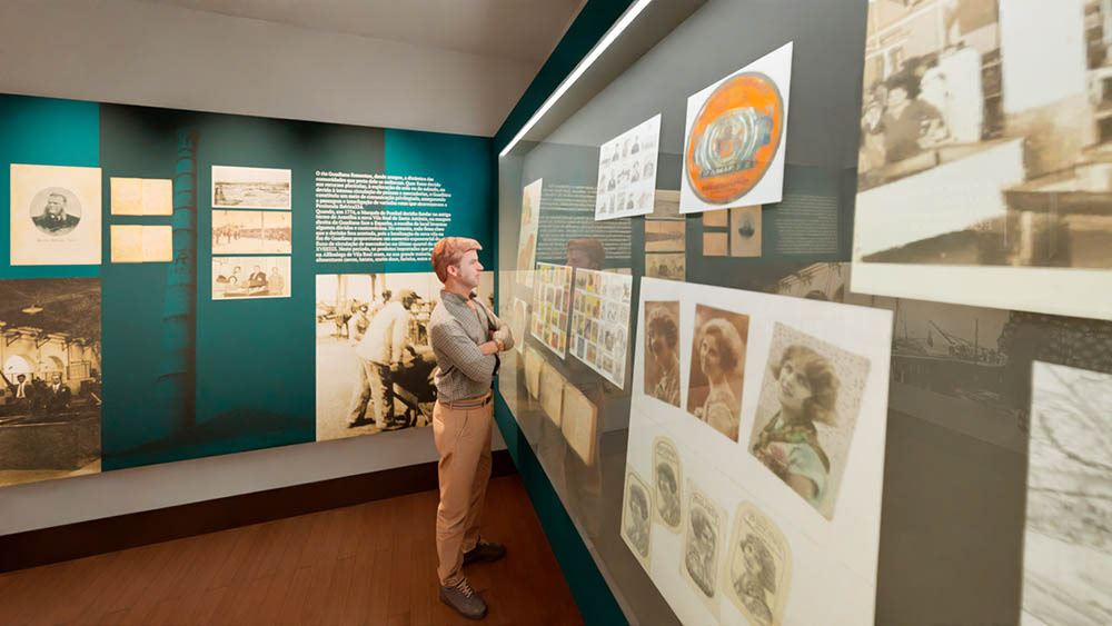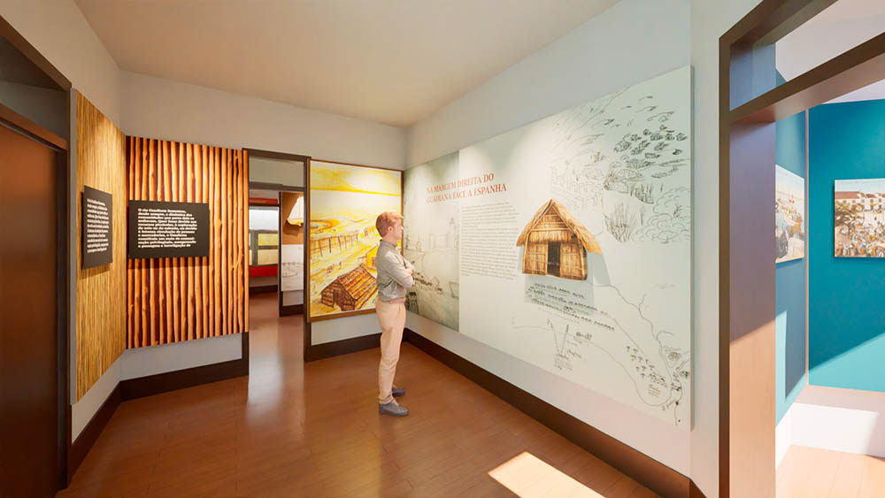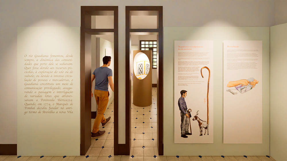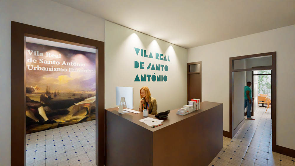 Simulação 3D de um novo museu em Vila Real de Santo António, Portugal. A simulação foi realizada à escala, com renderizações realistas, para permitir uma melhor avaliação dos projetos da Nerve Design nas áreas da museografia e do planeamento do espaço antes do desenvolvimento físico..