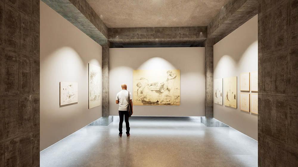 Simulação 3D para a utilização de um espaço municipal como galeria de arte em Vila Real de Santo António, Portugal. Uma representação virtual realista para mostrar o potencial do espaço para exposições, tal como idealizado pela Nerve Design.