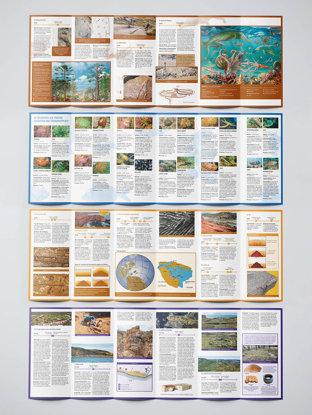 Design of a collection of four fold-out brochures titled 'Glimpse of the Barlavento', portable guides for scientific tourism in the Algarve, from the Centro Ciência Viva de Lagos – SCI TOUR. The main challenge of the project was to organize the information in a small leaflet without compromising clear and quick reading, something essential in guides of this type. Project made in collaboration with Nerve Design.