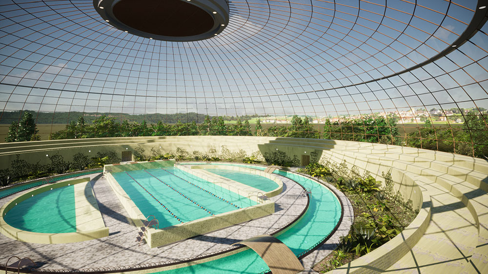 3D visualization / simulation of a concept pool complex, with interior garden. Experimental project which showcases Twinmotion, a real-time 3D rendering software.